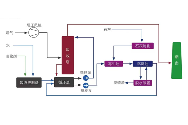 煙氣經(jīng)增壓風(fēng)機(jī)進(jìn)入吸收塔,與來自循環(huán)泵送入的吸收液接觸并被除去SO2。被洗滌后的煙氣經(jīng)塔內(nèi)除霧器除霧后進(jìn)入煙肉外排,出吸收塔的吸收液返回循環(huán)池循環(huán)使用。當(dāng)循環(huán)池內(nèi)吸收液的PH值降低至設(shè)定值時,排液泵自動啟動。將需再牛的吸收液泵入再生池進(jìn)行再生(使用石灰漿液再生),然后進(jìn)入沉淀池進(jìn)行沉淀,沉淀池的上清液返回循環(huán)池。沉淀池的沉渣( 硫酸鈣及亞硫酸鈣)進(jìn)入脫水裝置,脫水裝置形成的(濕)固態(tài)物即為脫硫渣,定期外排脫水裝置脫出的水返回沉淀池。運(yùn)行過程中,應(yīng)定期向循環(huán)池中加入新鮮的吸收液,以補(bǔ)充吸收液中所含的鈉堿量。
