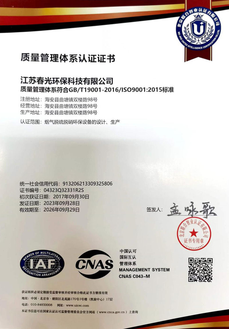 質(zhì)量管理體系認證證書